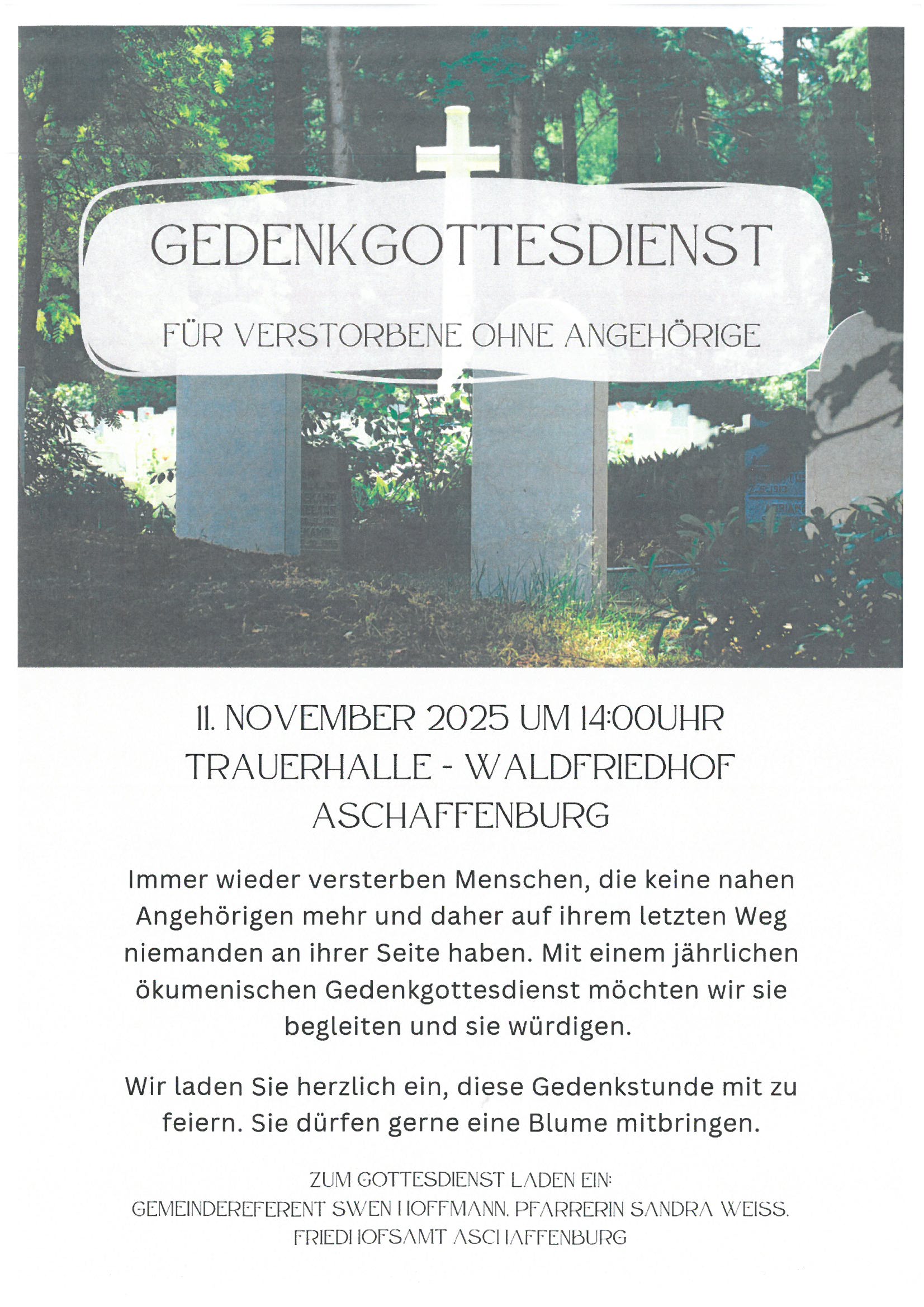 Wir laden Sie herzlich ein, diese Gedenkstunde mit zu feiern. Sie dürfen gerne eine Blume mitbringen.